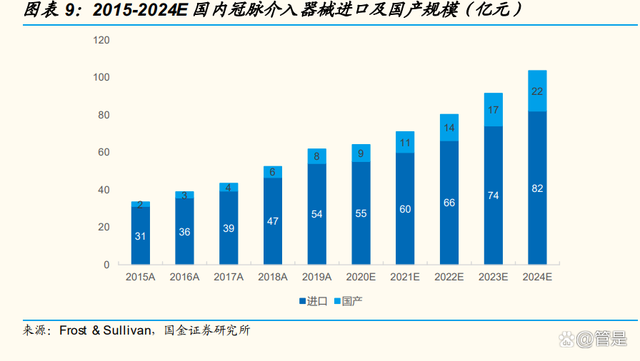 未来冠脉介入器械国产率有望持续提升。近年来部分领先的国产厂商依靠持续增加研发投入和丰富的产品线逐渐靠近国际先进水平,具备越来越强的市场竞争能力。随着国家支持性政策的深入和本土企业影响力的扩大,预计未来器械国产化率将持续提升。根据弗若斯特沙利文的预测,国产厂商市场规模将从 2019 年的 7.7 亿元快速增长至 2024 年的 21.5 亿元,复合年增长率达 22.7%,拥有的市场份额也将从 12%稳步上升至 21%,逐步蚕食外资厂商的市场份额。