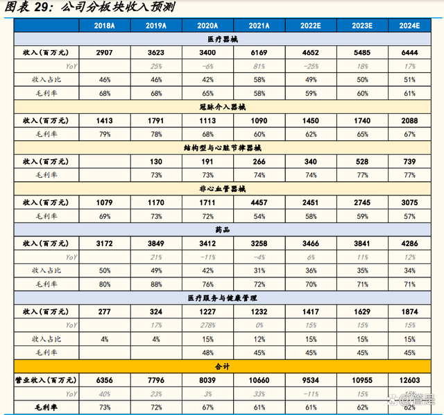 医疗器械板块:核心业务为冠脉植介入医疗器械,同时布局结构性心脏病、心脏节律管理、电生理、体外诊断、外科、麻醉等细分领域。