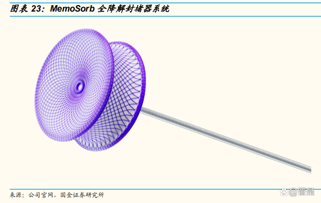 2022 年 2 月,公司全降解封堵器系统 MemoSorb 获得药监局注册批准,是全球首款获批上市的全降解封堵器产品。产品实现了封堵器从金属材质到全降解材质的创新升级,封堵器植入人体后将起到临时桥梁作用,促进完成自体组织修复后逐步降解,最终成为二氧化碳和水排出体外,植入心脏 12 个月内即实现完全降解,无异物留存,避免了传统金属封堵器植入后永久留存于体内带来的远期并发症风险。