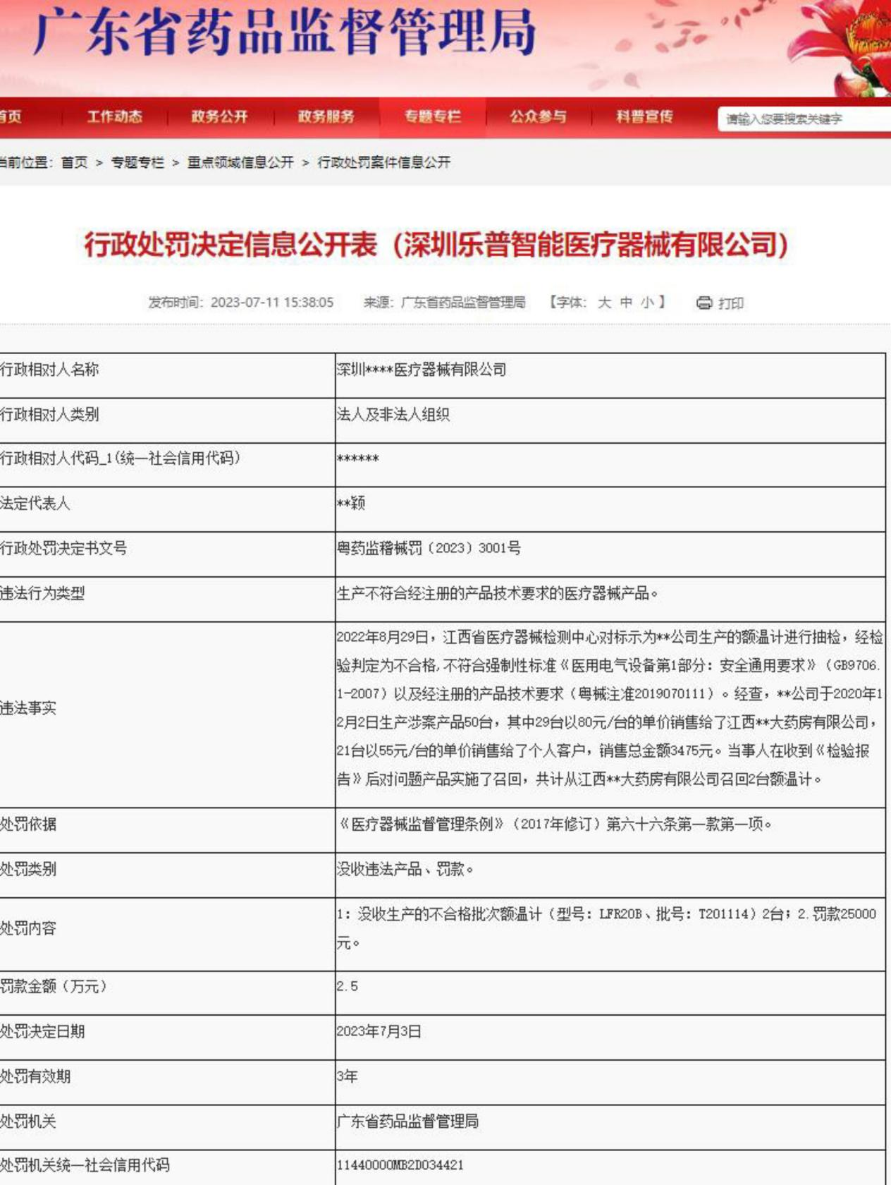 中国经济网北京7月14日讯近日,广东省药品监督管理局网站公布行政处罚信息公开表,行政处罚决定书(粤药监稽械罚〔2023〕3001号)显示,深圳乐普智能医疗器械有限公司生产不符合经注册的产品技术要求的医疗器械产品,被广东省药品监督管理局罚款25000元。处罚决定日期2023年7月3日。