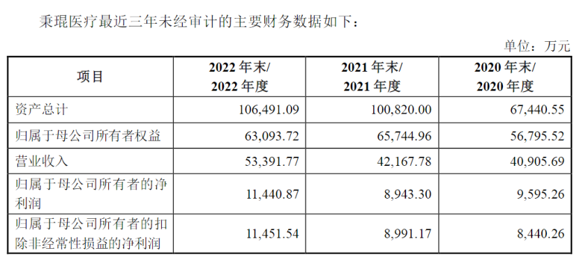 财务数据方面,2020年-2022年,秉琨医疗实现的营业收入分别为4.09亿元、4.22亿元、5.34亿元,归属于母公司股东的净利润分别为0.96亿元、0.89亿元、1.14亿元。