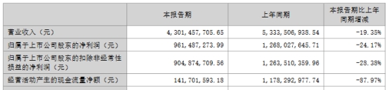 乐普医疗近日披露2023年半年度报告。上半年,公司营业收入43.01亿元,同比下降19.35%;归属于上市公司股东的净利润9.61亿元,同比下降24.17%;归属于上市公司股东的扣除非经常性损益的净利润9.05亿元,同比下降28.38%;经营活动产生的现金流量净额1.42亿元,同比下降87.97%。
