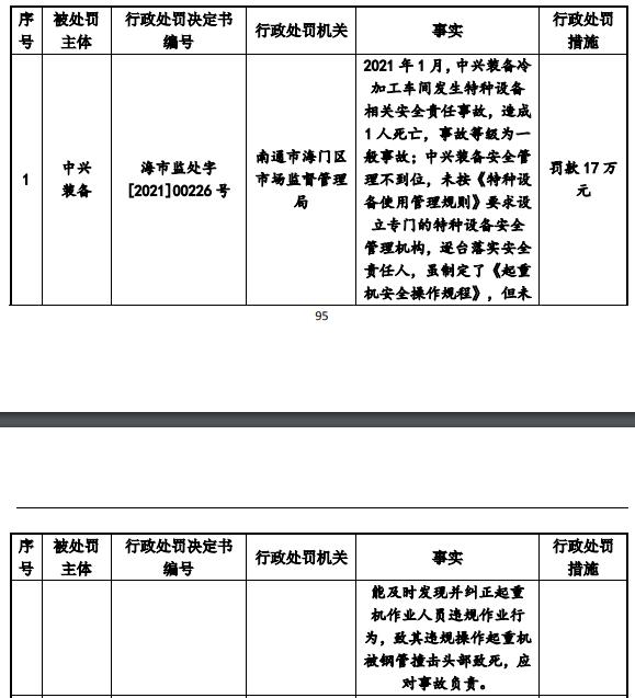 报告期内,中兴装备存在多宗行政处罚。其中,行政处罚决定书(海市监处字[2021]00226号)显示,2021年1月,中兴装备冷加工车间发生特种设备相关安全责任事故,造成1人死亡,事故等级为一般事故;中兴装备安全管理不到位,未按《特种设备使用管理规则》要求设立专门的特种设备安全管理机构,逐台落实安全责任人,虽制定了《起重机安全操作规程》,但未能及时发现并纠正起重机作业人员违规作业行为,致其违规操作起重机被钢管撞击头部致死,应对事故负责。