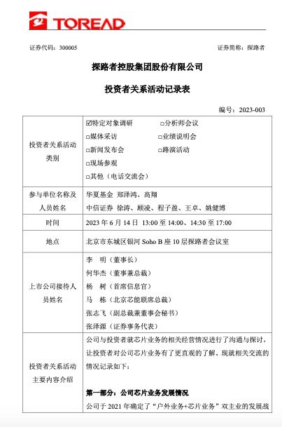 探路者控股集团股份有限公司(以下简称“探路者”或“公司”)6月15日晚间发布公告称,公司于6月14日接受了华夏基金、中信证券的特定对象调研。在调研中,探路者透露,未来公司将持续加大芯片业务投入力度,提升设计开发能力,开发符合市场趋势和客户需求的Mini LED背光和直显产品。
