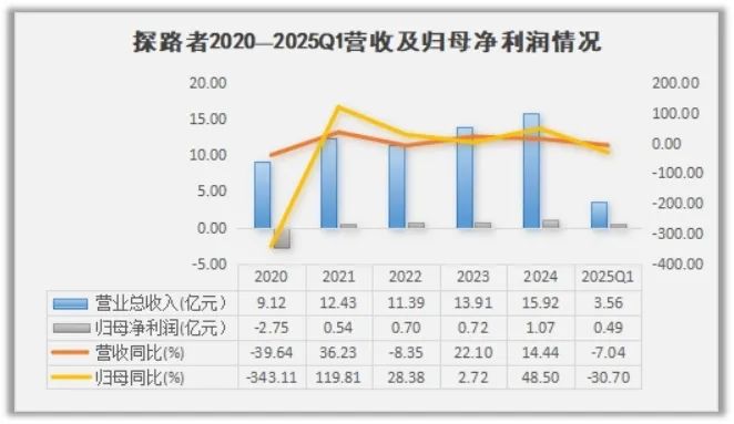 4月28日探路者发布了2024年年报和2025年一季报,2024年报告显示,公司全年实现总营业收入15.92亿元,同比增长14.44%;利润总额达到1.04亿元,同比增长105.79%;实现归母净利润1.07亿元,同比增长48.5%,2025年一季度财报中,也露出了隐忧,一季度营收3.56亿元,同比下降7.04%,归母净利润4932万元,同比下降30.7%。