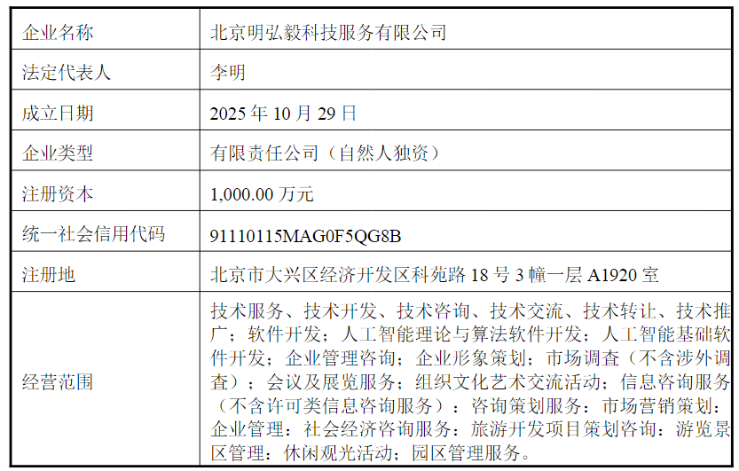 值得注意的是,探路者定增预案中发行对象的变化。探路者定增预案(修订版)显示,明弘毅成立于2025年10月29日。显然,明弘毅是李明为了参与定增临时决定成立的新公司。