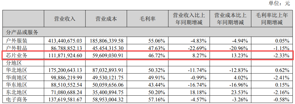 在2025年三季报中,探路者并未公布不同业务的营业收入变化数据。不过,公司2025年半年报显示,2025年上半年,其芯片业务的营业收入约为1.12亿元,较去年同期增长8.27%;而户外服装和户外鞋品的营业收入分别同比下滑4.83%和22.69%。