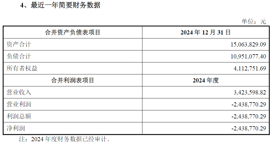 通域合盈2024年的净利润为亏损约244万元。探路者定增预案(修订版)显示,通域合盈成立于2018年12月20日,主要从事投资管理、资产管理业务,其2024年的资产合计仅约为1506万元,负债合计约为1095万元,所有者权益约为411万元,营业收入约为342万元,净利润为亏损约244万元。