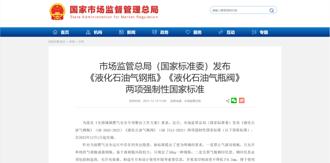 近日,我国发布《液化石油气钢瓶》(GB 5842-2023)《液化石油气瓶阀》(GB 7512-2023)两项强制性国家标准,于2023年12月1日起实施。