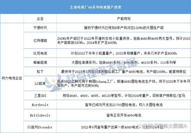 据悉,国内企业中,宁德时代已规划8条产线对应12GWh的大圆柱产能;亿纬锂能大圆柱电池预计2023年产能释放20GWh,2024年扩产至40GWh。