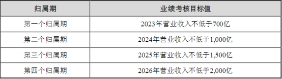 和前次激励计划相比,亿纬锂能此次大幅调高了公司层面的业绩考核目标。本激励计划共设有四个归属期,2023年至2026年考核目标值为营业收入分别不低于700亿、1000亿、1500亿、2000亿元。若营业收入实际完成率低于80%,归属比例将为零。