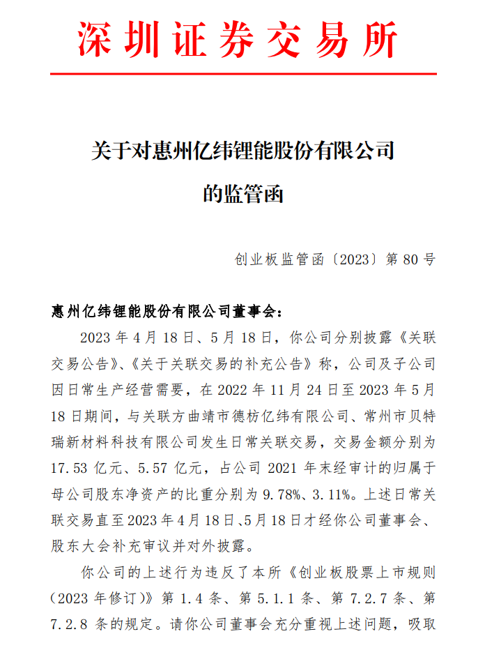深交所称,于4月18日与5月18日,亿纬锂能分别披露《关联交易公告》、《关于关联交易的补充公告》称,公司及子公司因日常生产经营需要,在2022年11月24日至2023年5月18日期间,与关联方曲靖市德枋亿纬有限公司、常州市贝特瑞新材料科技有限公司发生日常关联交易,交易金额分别为17.53 亿元、5.57 亿元,占公司2021年末经审计的归属于母公司股东净资产的比重分别为 9.78%、3.11%。