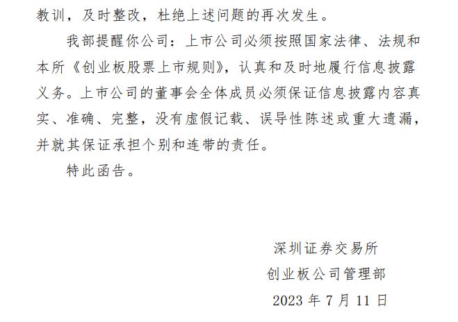 深交所提醒,上市公司必须按照国家法律、法规和本所《创业板股票上市规则》,认真和及时地履行信息披露义务。上市公司的董事会全体成员必须保证信息披露内容真实、准确、完整,没有虚假记载、误导性陈述或重大遗漏,并就其保证承担个别和连带的责任。