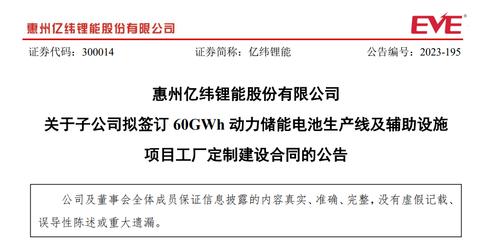 12月8日,惠州亿纬锂能股份有限公司子公司湖北亿纬动力有限公司与荆门高新技术产业开发区管理委员会(以下简称“荆门高新区管委会”)签订《合同书》,在荆门高新区投资建设60GWh动力储能电池生产线及辅助设施项目,本项目总投资额约108亿元,其中固定资产投资约为80亿元。