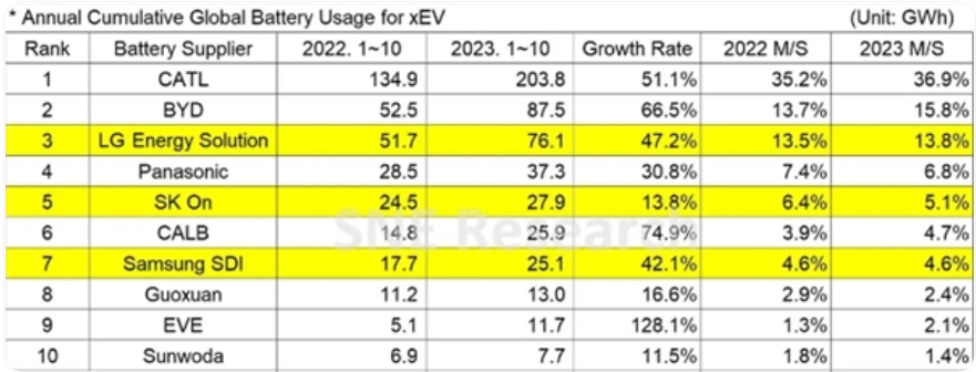 根据韩国市场调研机构SNE Research统计数据,今年1-10月全球动力电池装车量达到552.2GWh,同比增长44%。其中,全球前十分别是宁德时代、比亚迪、LG能源、松下、SK On、中创新航、三星SDI、国轩高科、亿纬锂能和欣旺达。