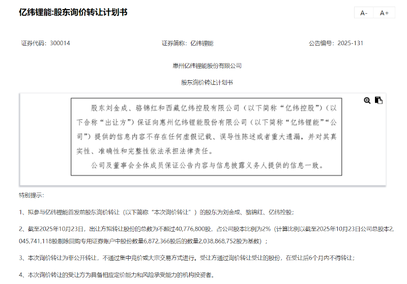 当新能源行业高歌猛进时,亿纬锂能前三季度业绩却增收不增利。10月24日,亿纬锂能发布公告披露,公司控股股东及一致行动人刘金成、骆锦红、亿纬控股,拟转让4077.68万股。