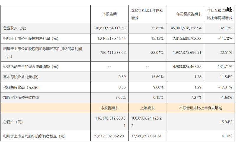 亿纬锂能发布的三季报显示,前三季度公司实现营收450.02亿,同比增长32.17%,归母净利润28.16亿,同比下降11.70%。其中,第三季度实现营收168.32亿元,同比增长35.85%,归母净利润12.11亿元,同比增长15.13%。