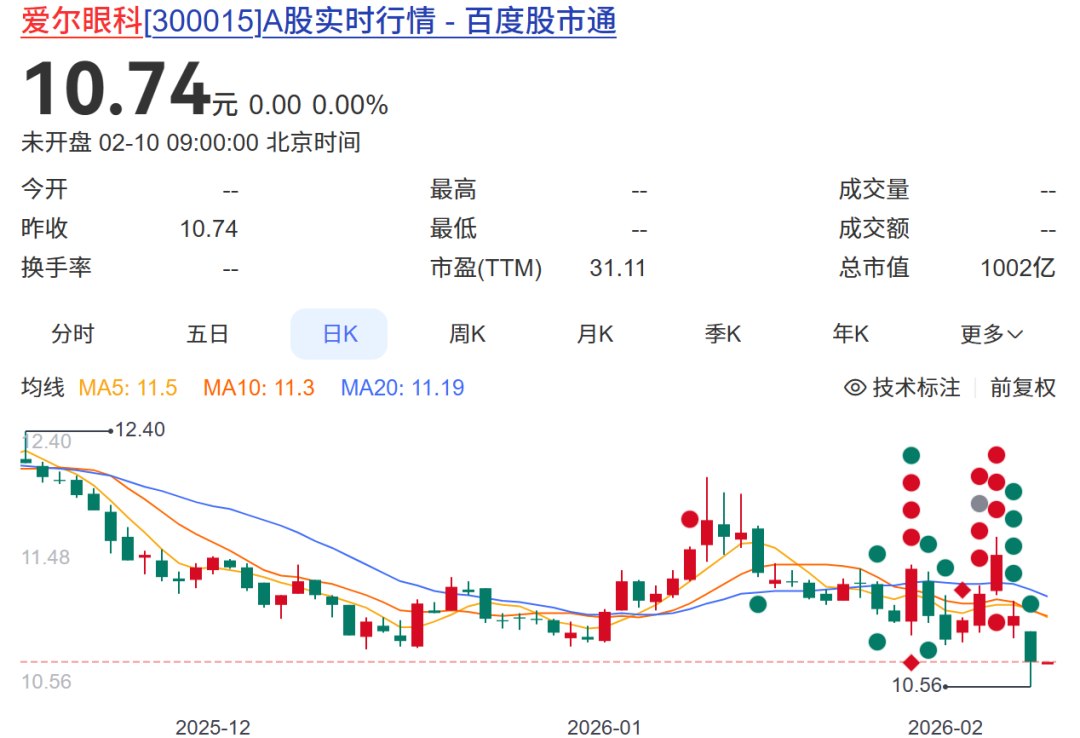 一石激起千层浪,尽管爱尔眼科紧急发布声明试图划清与涉事医院的界限,但资本市场反应迅速且果断。2026年2月6日爱尔眼科股价下跌约4%,最新市值定格在1000亿元附近,较其高峰时期的4000亿元市值已缩水约四分之三。