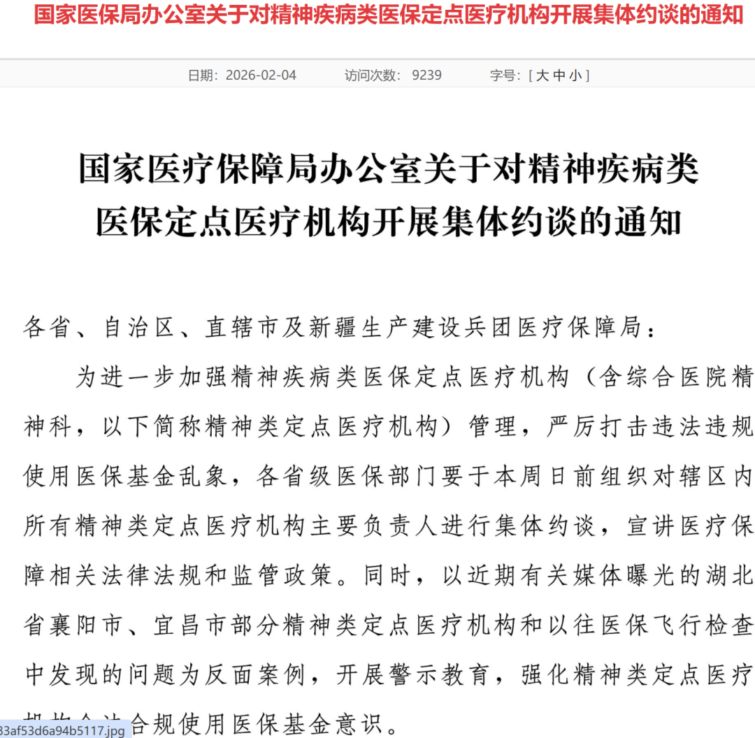 监管环境正在发生深刻变化。国家医保局针对此次事件已迅速行动,印发《关于对精神疾病类医保定点医疗机构开展集体约谈的通知》,并要求各地本周内完成约谈。更严厉的监管措施正在路上——2026年,精神类定点医疗机构将成为专项飞检的重点对象,违规者将面临从重处罚甚至移送司法机关。