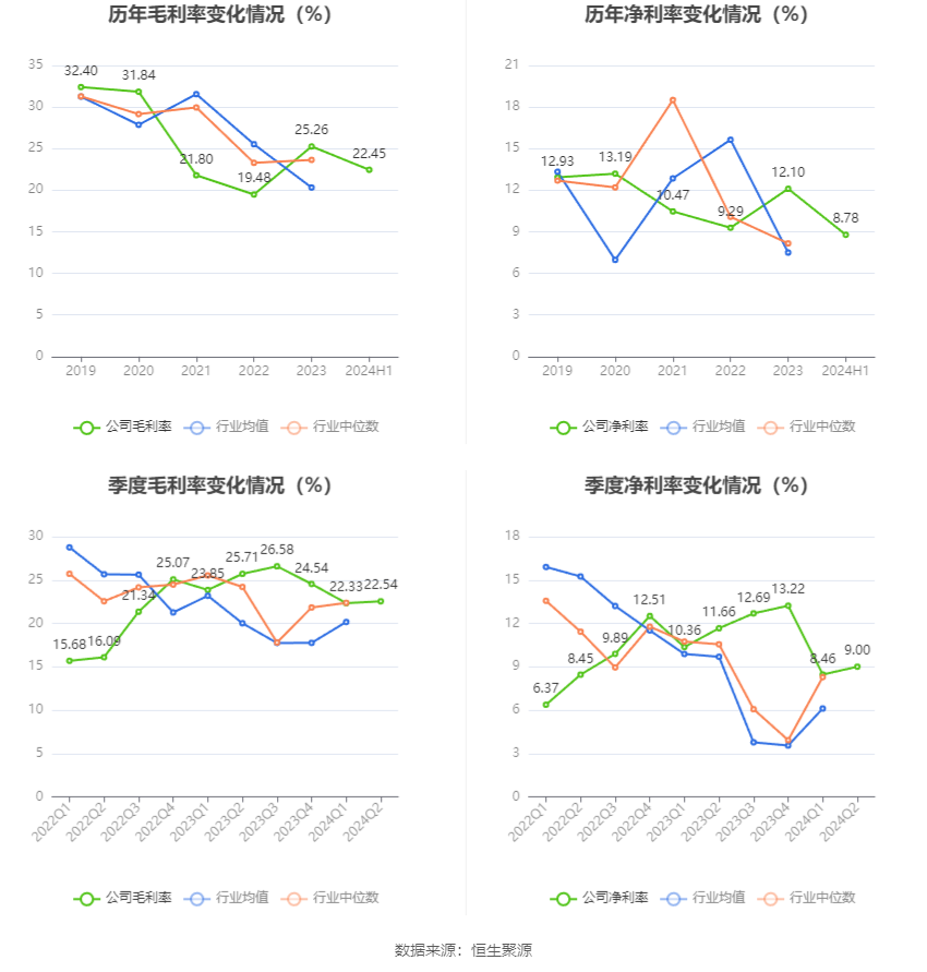 2024年上半年,公司毛利率为22.45%,同比下降2.44个百分点;净利率为8.78%,较上年同期下降2.30个百分点。从单季度指标来看,2024年第二季度公司毛利率为22.54%,同比下降3.17个百分点,环比上升0.21个百分点;净利率为9.00%,较上年同期下降2.66个百分点,较上一季度上升0.54个百分点。