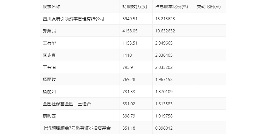 半年报显示,2024年上半年末公司十大流通股东中,新进股东为上汽颀臻颀鑫7号私募证券投资基金,取代了一季度末的工银瑞信战略转型主题股票型证券投资基金。在具体持股比例上,四川发展引领资本管理有限公司持股有所上升,全国社保基金四一三组合持股有所下降。
