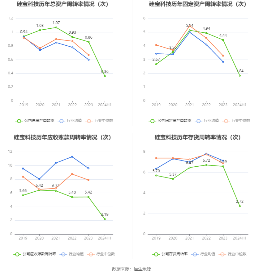 营运能力方面,2024年上半年,公司公司总资产周转率为0.36次,上年同期为0.41次(2023年上半年行业平均值为0.30次,公司位居同行业1/10);固定资产周转率为1.84次,上年同期为2.14次(2023年上半年行业平均值为1.44次,公司位居同行业3/10);公司应收账款周转率、存货周转率分别为2.19次、2.72次。