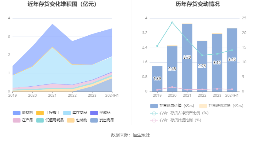 从存货变动来看,截至2024年上半年末,公司存货账面价值为3.46亿元,占净资产的14.19%,较上年末增加3098.02万元。其中,存货跌价准备为276.86万元,计提比例为0.79%。