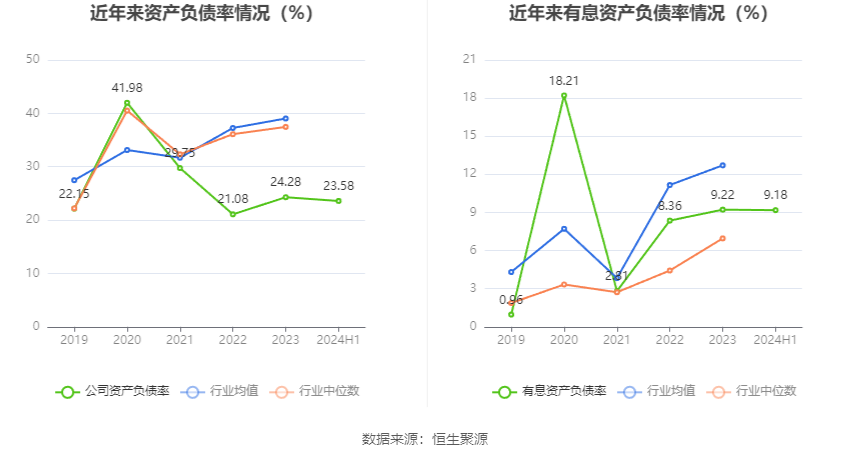 在偿债能力方面,公司2024年上半年末资产负债率为23.58%,相比上年末下降0.70个百分点;有息资产负债率为9.18%,相比上年末下降0.04个百分点。