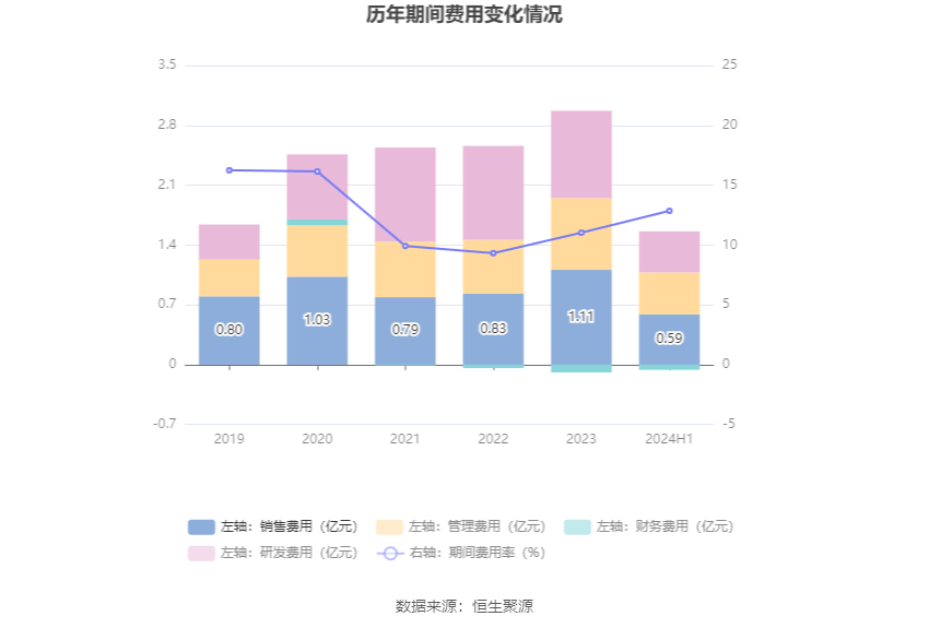 2024年上半年,公司期间费用为1.49亿元,较上年同期增加1598.75万元;期间费用率为12.86%,较上年同期上升1.72个百分点。其中,销售费用同比增长19.05%,管理费用同比增长37.12%,研发费用同比下降5.08%,财务费用由去年同期的-210.83万元变为-621.35万元。
