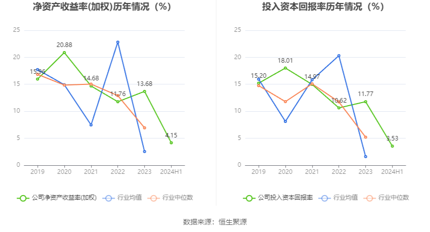 盈利能力方面, 2024年半年度公司加权平均净资产收益率为4.15%,同比下降1.72个百分点。公司2024年上半年投入资本回报率为3.53%,较上年同期下降1.68个百分点。