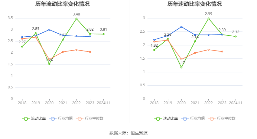 2024年上半年,公司流动比率为2.81,速动比率为2.32。