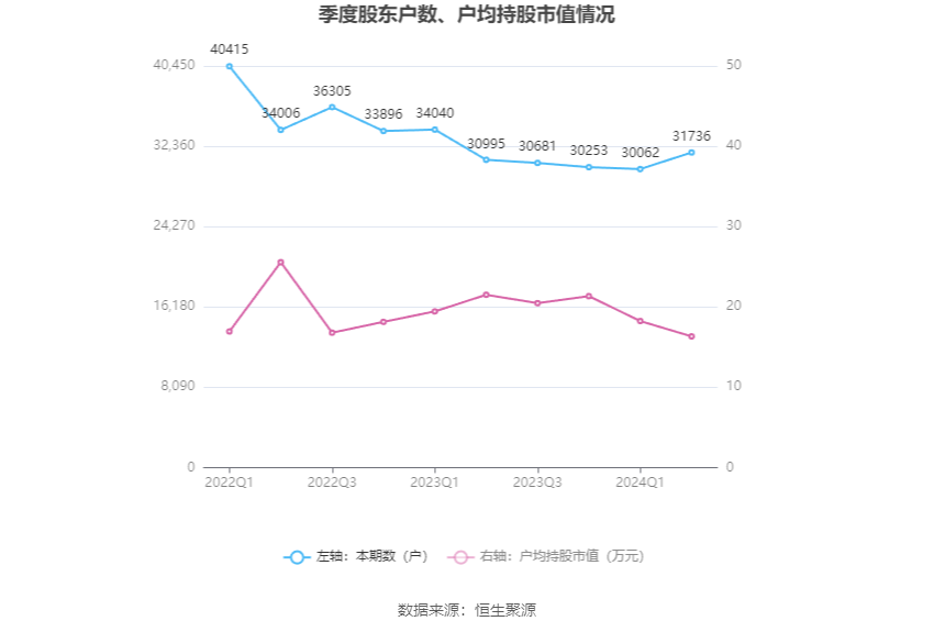 筹码集中度方面,截至2024年上半年末,公司股东总户数为3.17万户,较一季度末增长了1674户,增幅5.57%;户均持股市值由一季度末的18.24万元下降至16.33万元,降幅为10.47%。