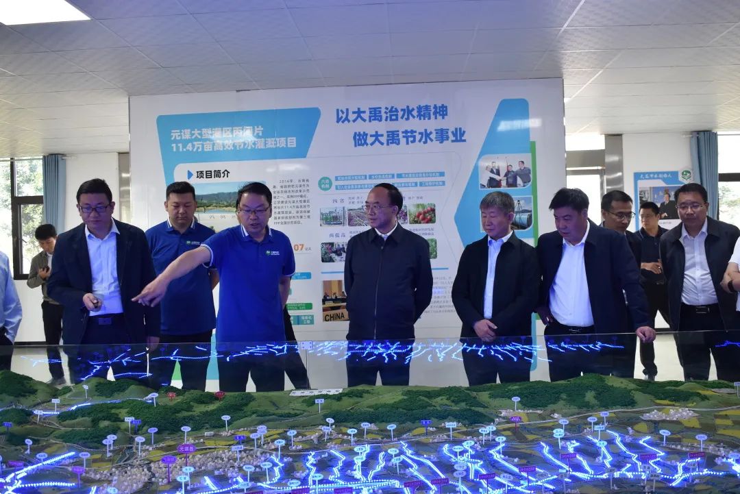 在元谋县高效节水灌溉项目运营管理中心,调研组认真听取了元谋县水务局局长吴元顺对全县灌区建设及规划情况的汇报;并听取了大禹农水集团副总裁兼西南总公司董事长徐希彬汇报大禹节水的元谋模式、元谋现场会的准备以及大禹节水集团的相关情况,介绍了大禹节水通过两手发力推进农业水价改革方面的经验做法,以及在元谋大型灌区丙间片11.4万亩项目中投资、建设及运营过程中的融合发展情况。