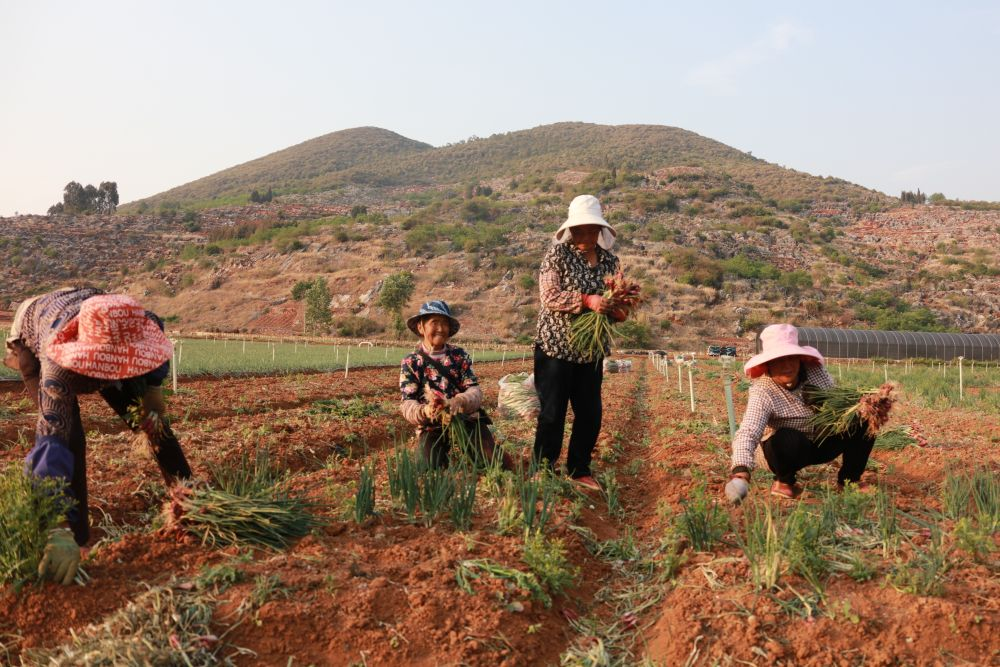 在弥泸灌区泸西县中枢片区,当地百姓正在采收香葱。新华社记者刘诗平摄