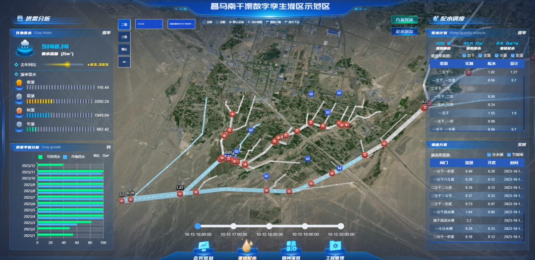 模型分析灌区水源月、旬、日来水,预测灌区农业、工业、生态、生活需水情况,进行供需平衡分析后,按“缺水最少、损耗最小”的原则进行渠道水量优化配置,输出渠道配水方案,最后依据“按需定供”的原则模拟仿真各分水闸闸门开度、过闸流量,输出配水调度方案。慧图科技灌区水资源配置调度模型已在甘肃省疏勒河流域昌马灌区、湖南欧阳海灌区的调度中应用,满足了渠道配水调度科学决策与农田灌溉精准管理的需求。
