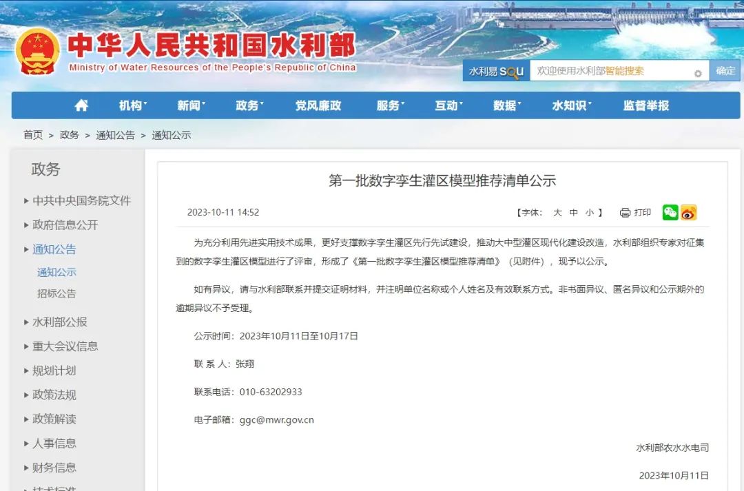10月18日,水利部农水水电司发布的《第一批数字孪生灌区模型推荐清单》公示结束(点击阅读原文跳转链接),大禹节水旗下慧图科技集团“灌区水资源配置调度模型”,以及大禹节水旗下乐水新源公司“灌区渠系优化配水模型”成功入选。