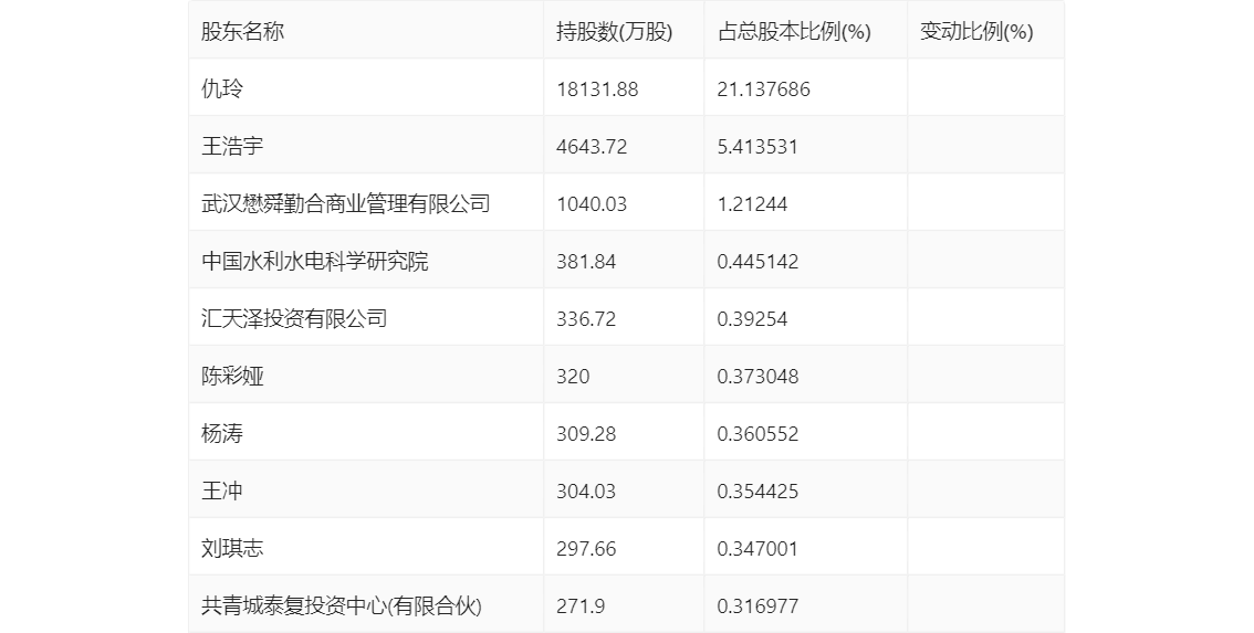 半年报显示,2024年上半年末公司十大流通股东中,新进股东为陈彩娅、杨涛、王冲、刘琪志,取代了一季度末的华泰柏瑞富利灵活配置混合型证券投资基金、华泰柏瑞鼎利灵活配置混合型证券投资基金、华泰柏瑞多策略灵活配置混合型证券投资基金、中信证券股份有限公司。在具体持股比例上,武汉懋舜勤合商业管理有限公司持股有所上升,仇玲、王浩宇、汇天泽投资有限公司、共青城泰复投资中心(有限合伙)持股有所下降。