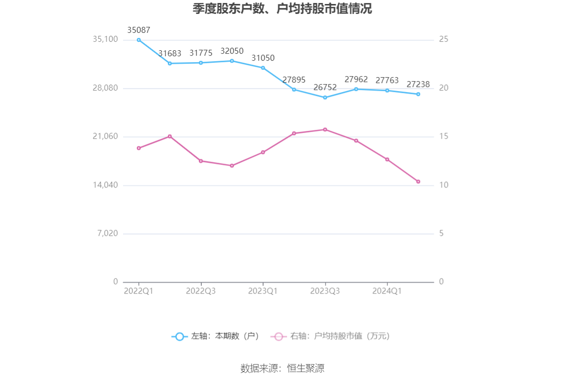 筹码集中度方面,截至2024年上半年末,公司股东总户数为2.72万户,较一季度末下降了525户,降幅1.89%;户均持股市值由一季度末的12.67万元下降至10.39万元,降幅为18.00%。