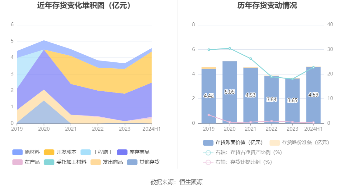 从存货变动来看,截至2024年上半年末,公司存货账面价值为4.59亿元,占净资产的22.76%,较上年末增加9361.46万元。其中,存货跌价准备为175.77万元,计提比例为0.38%。