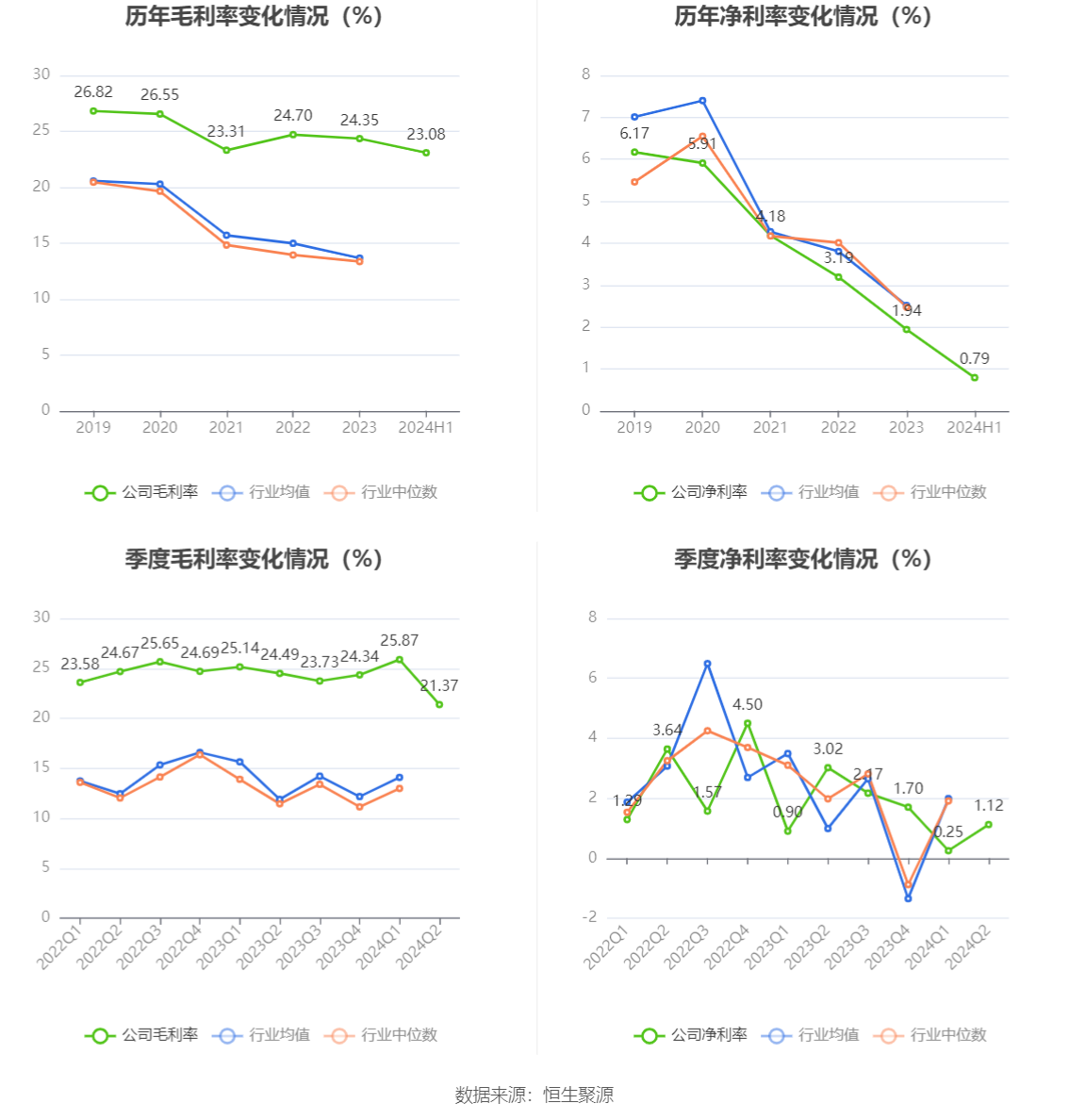 2024年上半年,公司毛利率为23.08%,同比下降1.68个百分点;净利率为0.79%,较上年同期下降1.36个百分点。从单季度指标来看,2024年第二季度公司毛利率为21.37%,同比下降3.12个百分点,环比下降4.50个百分点;净利率为1.12%,较上年同期下降1.90个百分点,较上一季度上升0.87个百分点。