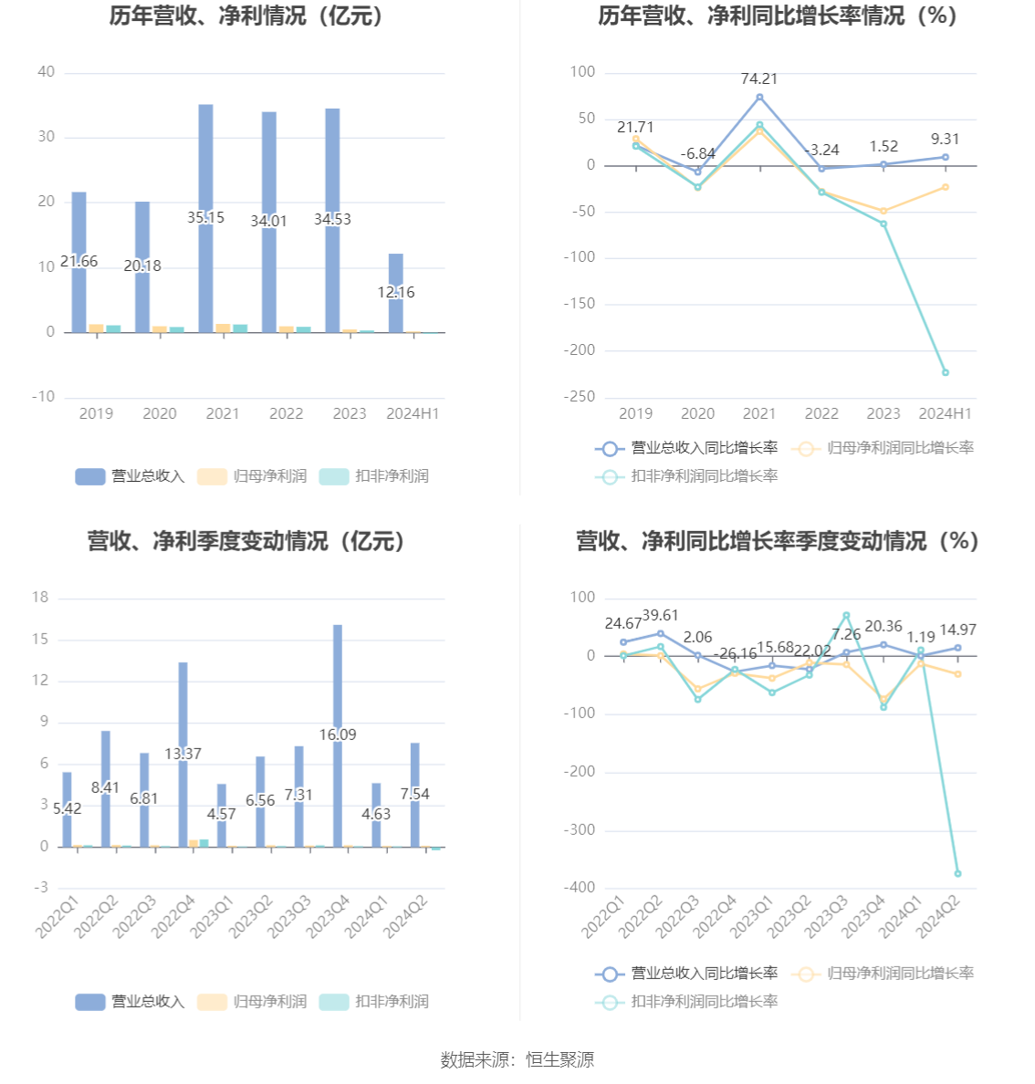 根据半年报,公司第二季度实现营业总收入7.54亿元,同比增长14.97%,环比增长62.82%;归母净利润997.29万元,同比下降30.36%,环比增长12.17%;扣非净利润-2241.33万元,同比下降374.25%,环比下降482.09%。