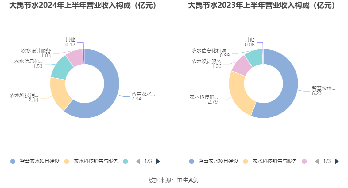 分产品来看,2024年上半年公司主营业务中,智慧农水项目建设收入7.34亿元,同比增长17.84%,占营业收入的60.35%;农水科技销售与服务收入2.14亿元,同比下降23.06%,占营业收入的17.63%;农水信息化和项目运营服务收入1.53亿元,同比增长54.77%,占营业收入的12.57%。