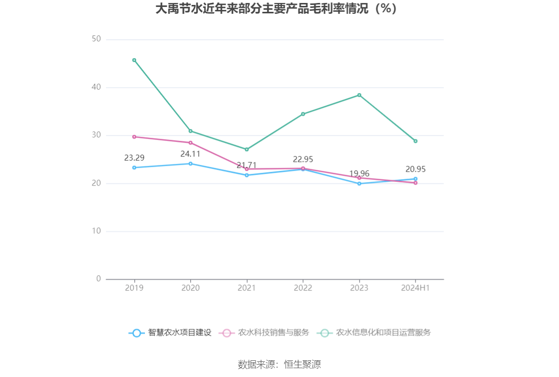 分产品看,智慧农水项目建设、农水科技销售与服务、农水信息化和项目运营服务2024年上半年毛利率分别为20.95%、20.12%、28.82%。