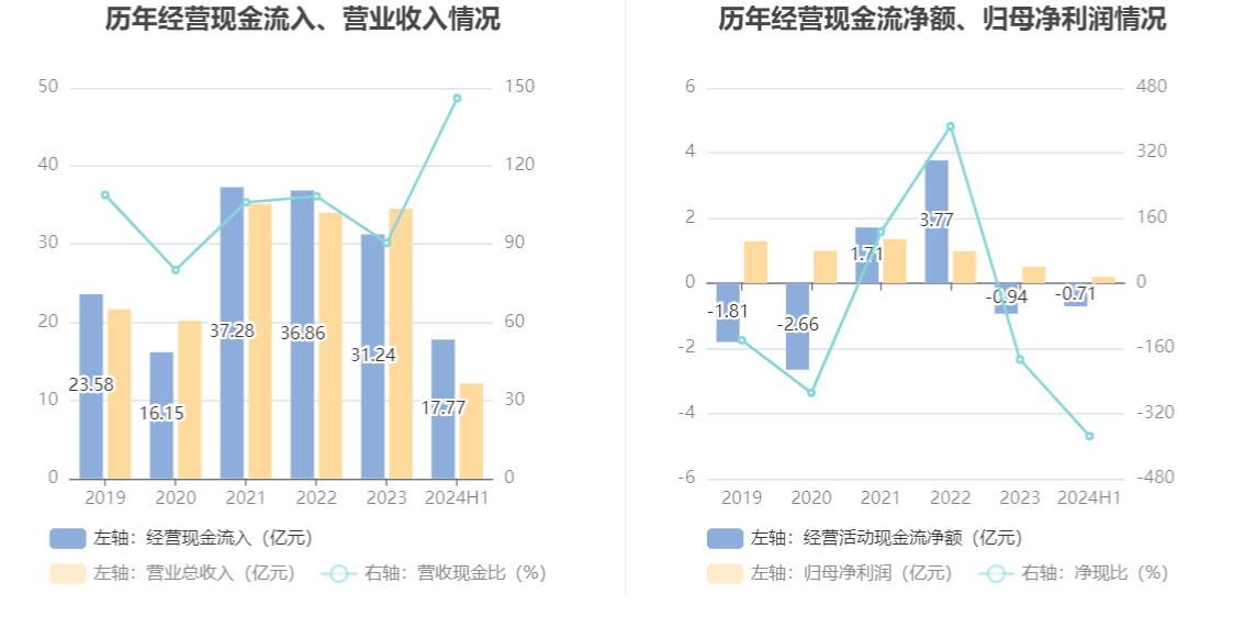 2024年上半年,公司营业收入现金比为146.04%,净现比为-376.05%。