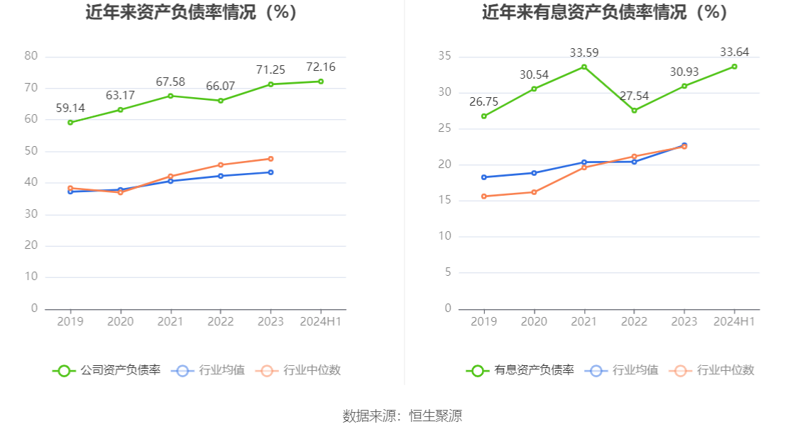 在偿债能力方面,公司2024年上半年末资产负债率为72.16%,相比上年末上升0.91个百分点;有息资产负债率为33.64%,相比上年末上升2.71个百分点。
