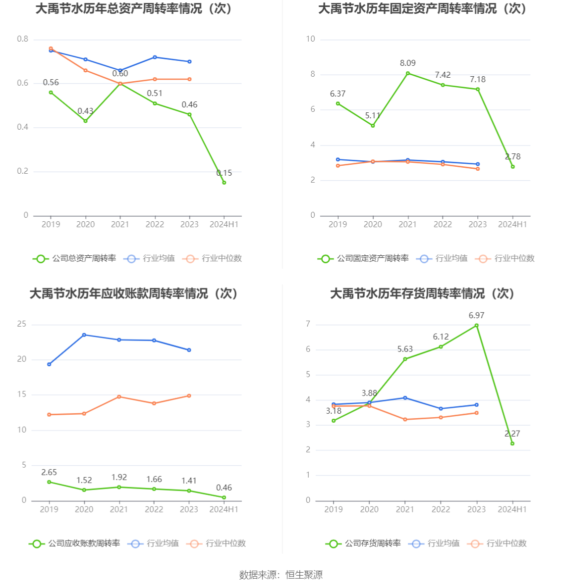 营运能力方面,2024年上半年,公司公司总资产周转率为0.15次,上年同期为0.16次(2023年上半年行业平均值为0.32次,公司位居同行业90/111);固定资产周转率为2.78次,上年同期为2.28次(2023年上半年行业平均值为1.34次,公司位居同行业28/111);公司应收账款周转率、存货周转率分别为0.46次、2.27次。