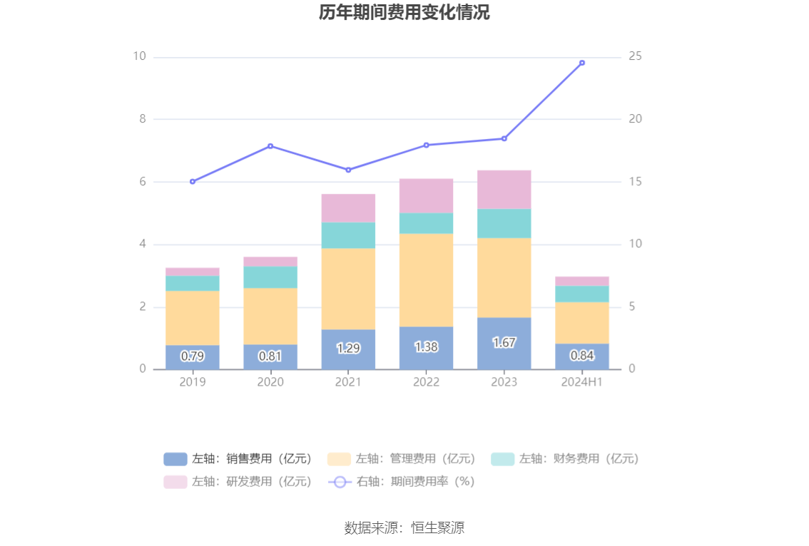2024年上半年,公司期间费用为2.99亿元,较上年同期增加5400.86万元;期间费用率为24.54%,较上年同期上升2.57个百分点。其中,销售费用同比增长25.9%,管理费用同比增长21.12%,研发费用同比下降4.78%,财务费用同比增长39.74%。
