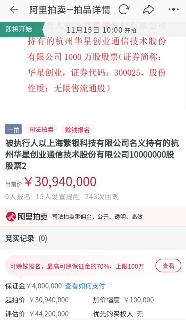 2021年8月19日,江苏省泰州市中级人民法院正式下达执行裁定书,判决追缴违法所得,拍卖变卖被执行人以上海繁银科技有限公司名义持有的杭州华星创业通信技术股份有限公司股票合计50901030股。