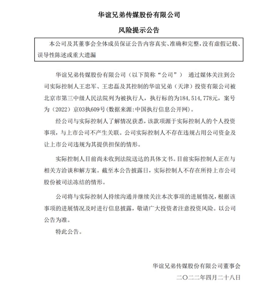 此外,在4月22日,深圳证券交易所发布关于对王忠军、王忠磊给予通报批评处分的决定。通报显示2009年10月30日至2021年12月20日,华谊兄弟持股5%以上股东、实际控制人王忠军、王忠磊持有华谊兄弟权益比例由34.41%下降至23.74%,变动比例为10.67%。
