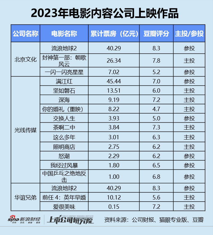 相较之下,北京文化和华谊兄弟报告期内均只有3部作品上映,主投作品分别为1部、2部。北京文化主投的《封神一》上映后连续多日逆跌,最终以26.34亿票房收官。但参投作品《一闪一闪亮星星》没能延续原版电视剧口碑,卷入预售退票、营销拉胯多轮舆论风波,豆瓣平台上超8.2万人打出了5.2分。